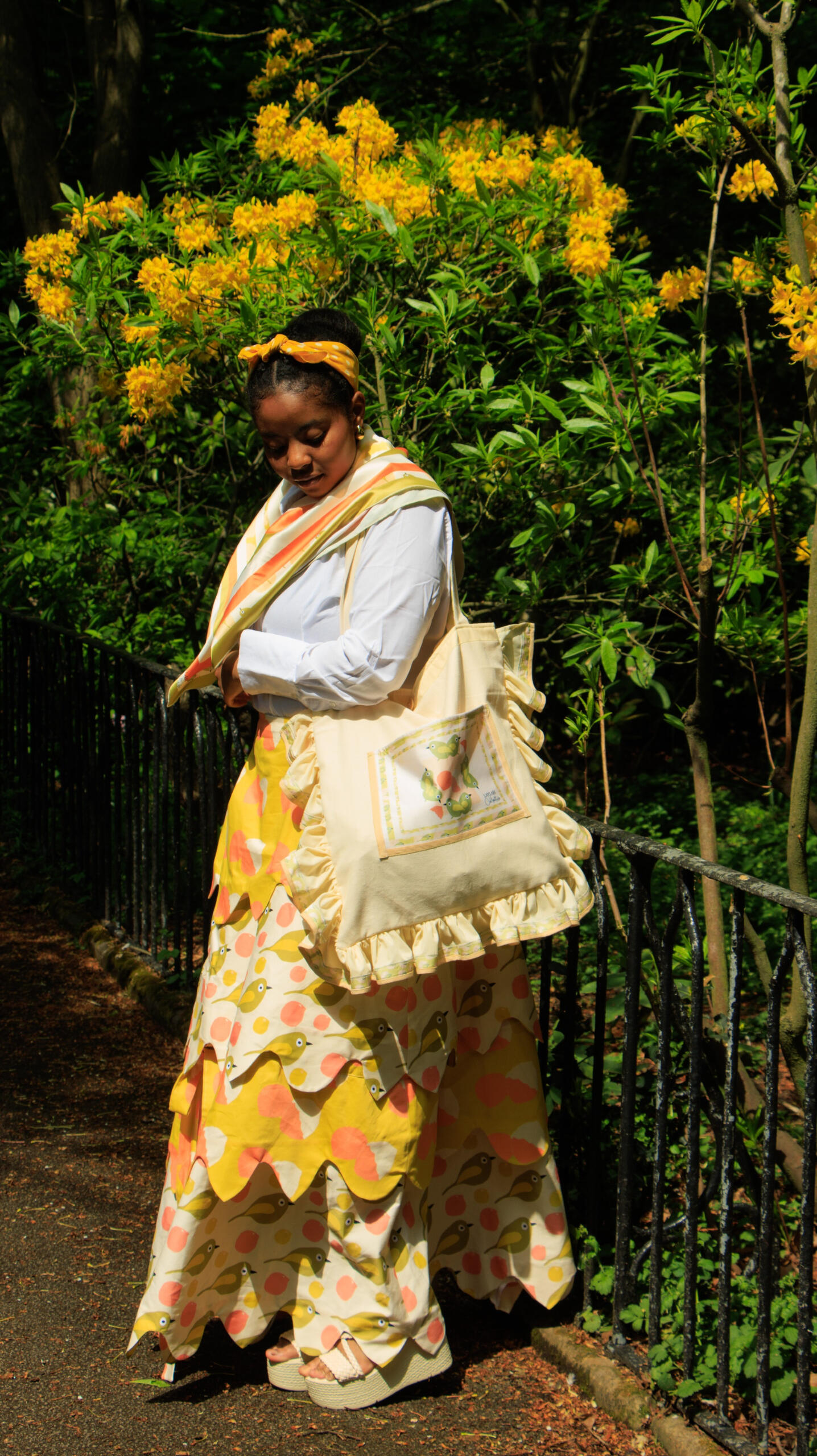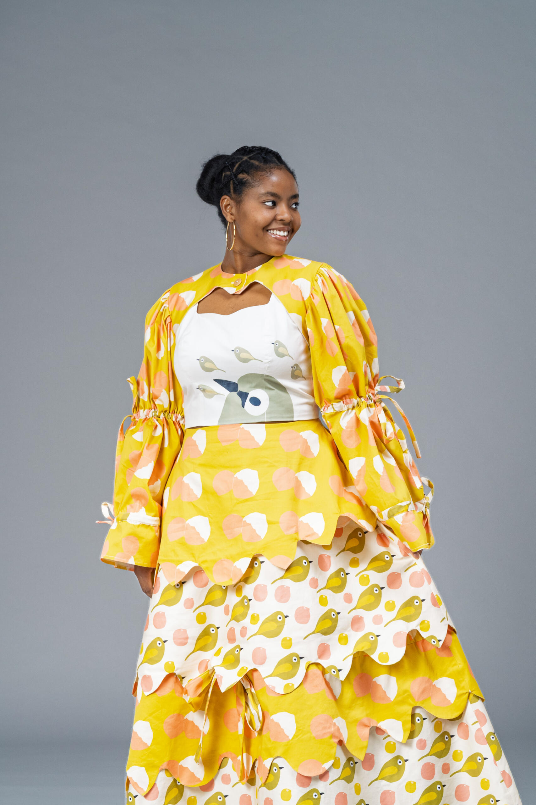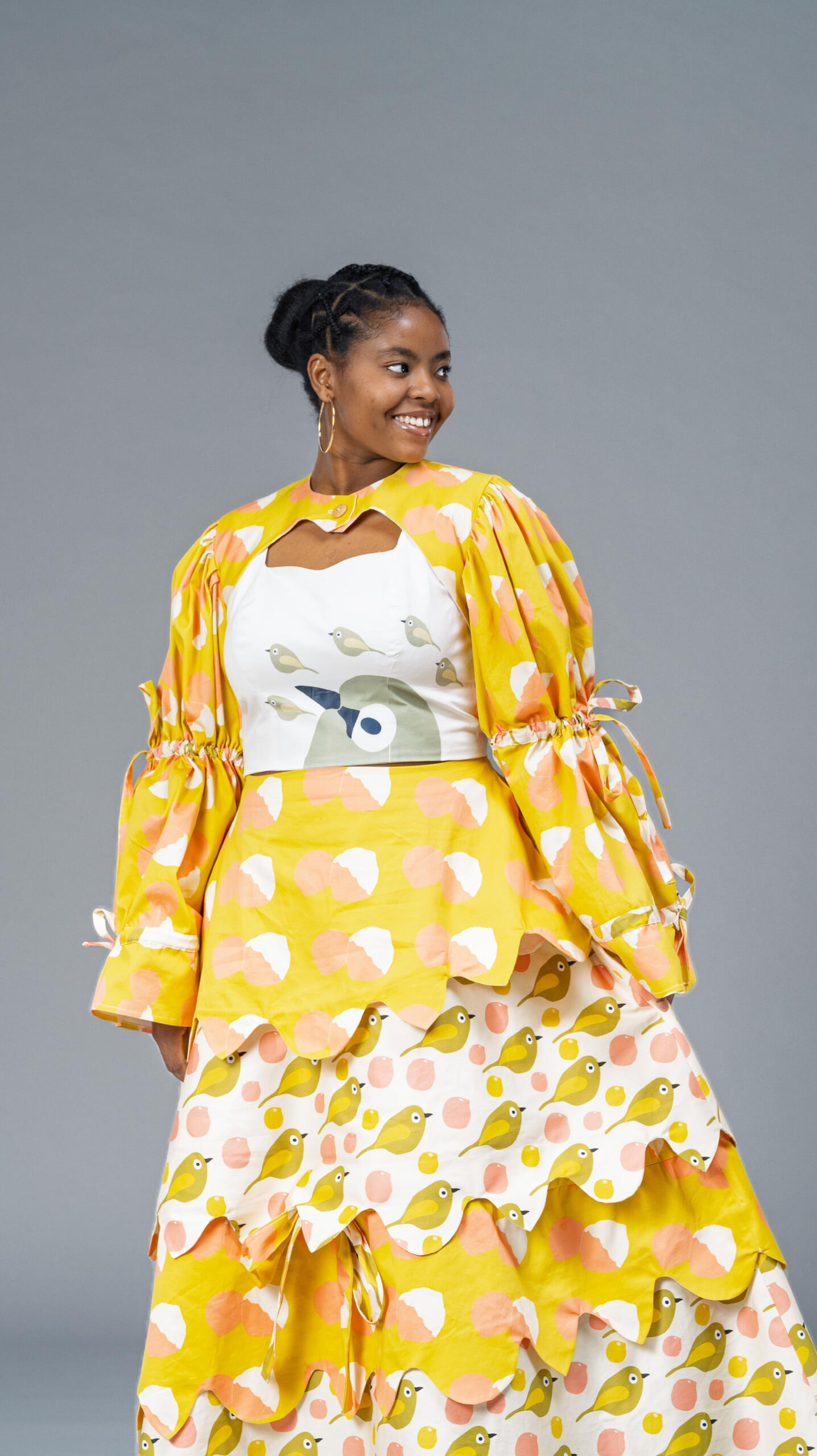 A coastal dreamscape reimagined in cotton satin and crepe de chine. Nicole’s prints are steeped in symbolism — the delicate Taita White Eye bird, the soft shape of the madafu, and the sweeping lines of Swahili architecture.The colour palette dances between coral, ivory, and the deep blues of the Indian Ocean. Each piece is designed with the curvy woman in mind: structured yet soft, bold yet wearable. With gathering techniques, drawstring play, and signature bust shaping, Urembo wa Pwani is a masterclass in thoughtful construction.#NicoleTikolo #FashanneAwards #CoastalBeauty